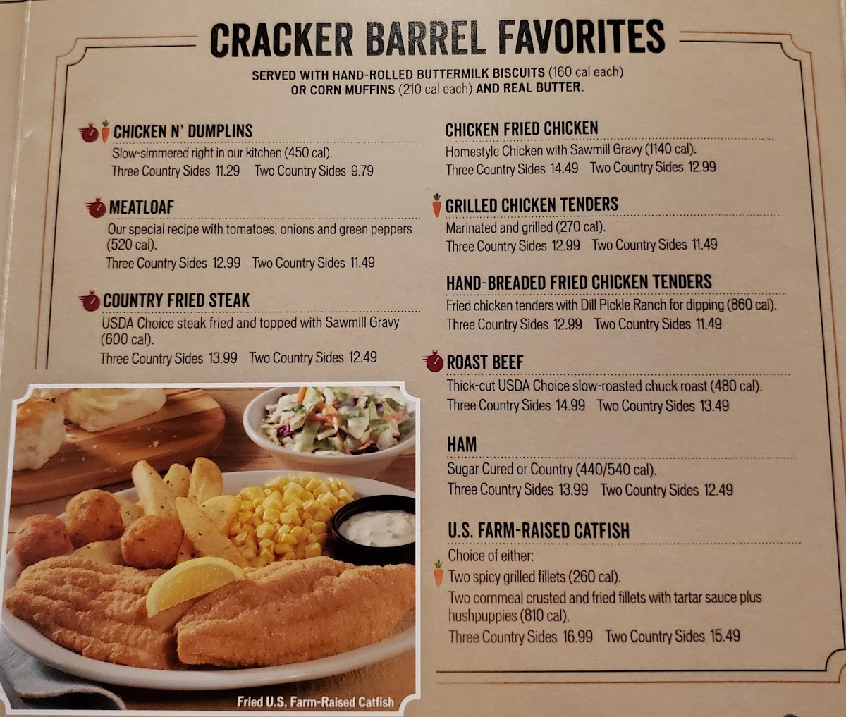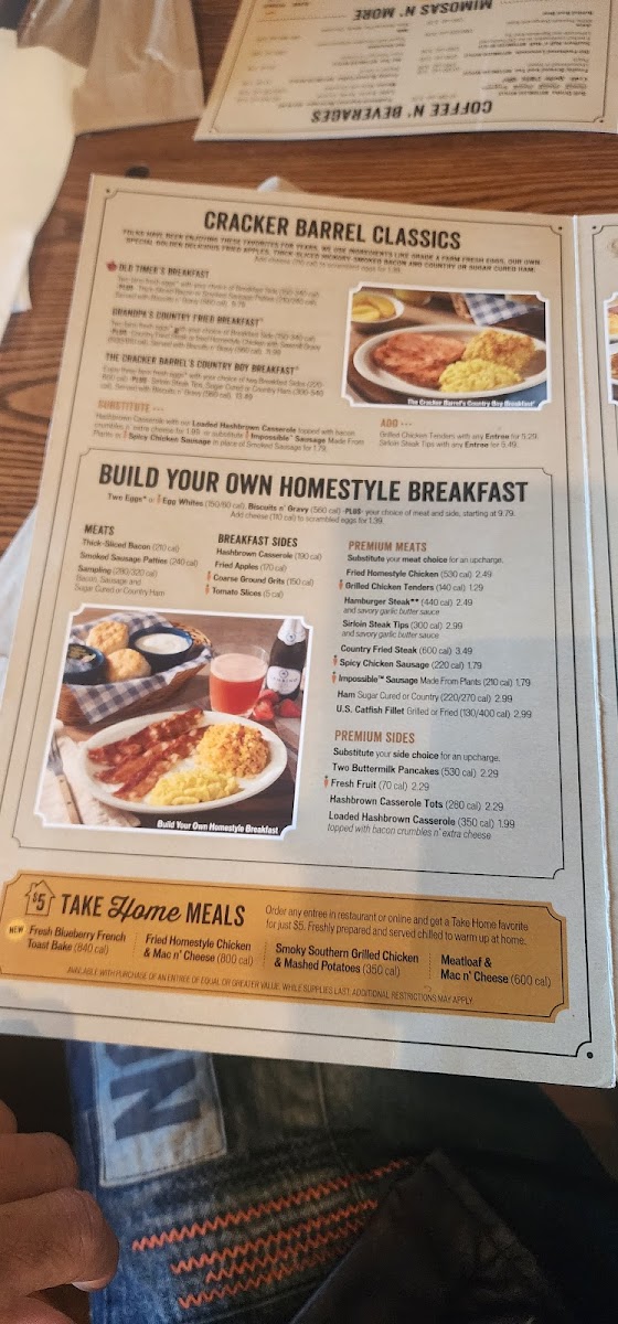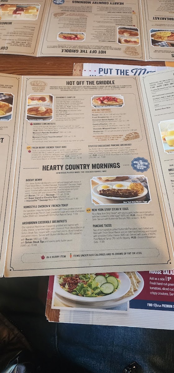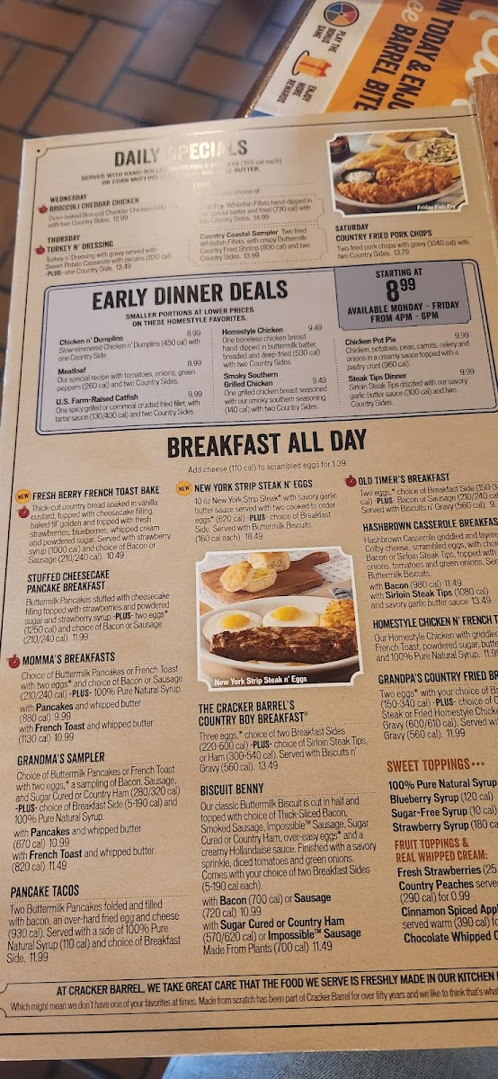 Cracker Barrel Old Country Store offers a comforting taste of traditional Southern and American cuisine in a warm, rustic setting. Known for hearty, homestyle dishes, the menu shines with all-day breakfast staples like the New York Strip Steak & Eggs and the classic Sunrise Pancake Special, featuring fluffy buttermilk pancakes paired with eggs or thick-cut bacon. Signature sweets such as Biscuit Beignets and Peach Cobbler evoke that nostalgic Southern charm, while savory options like the Hashbrown Casserole Shepherd’s Pie and slow-braised Pot Roast highlight the brand’s dedication to comforting, flavorful meals.